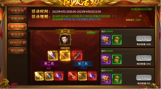 活动内容:开服前5天,每天开启一个冲榜活动,角色满足指定条件即可领取超多丰厚奖励