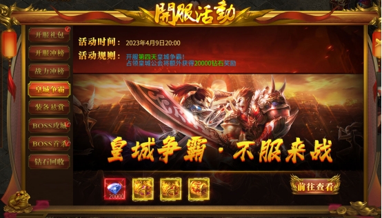 活动内容:开服第四天开启皇城争霸 占领皇城行会额外获得20000钻石奖励