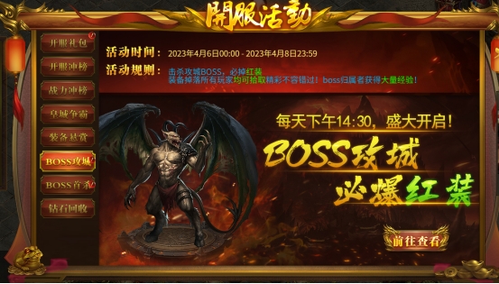 活动内容:开服3天,每天下午14:30BOSS攻城必爆红装