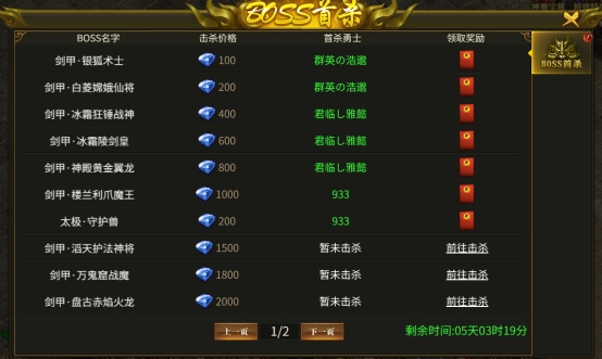 活动内容:首次击杀对应BOSS可以获得元宝奖励