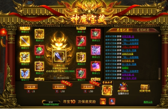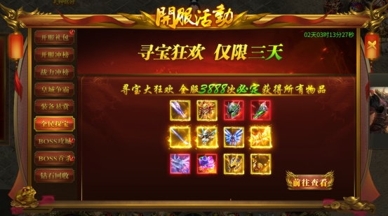 活动内容:开服第三天开启,每次寻宝都奖励,寻宝10次可获得保底奖励。