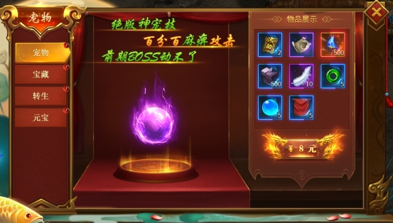 活动内容:宠物、宝藏、转生、元宝