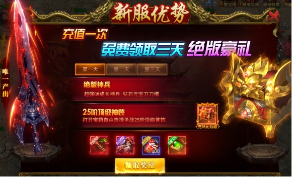 第一天:GM·超级神兵,灵宠貂蝉,元宝袋*100,等级直升丹*1